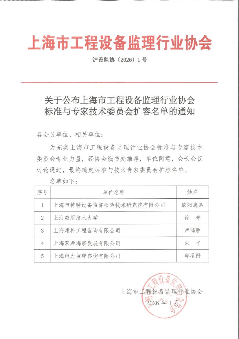 关于公布上海市工程设备监理行业协会标准与专家技术委员会扩容名单的通知